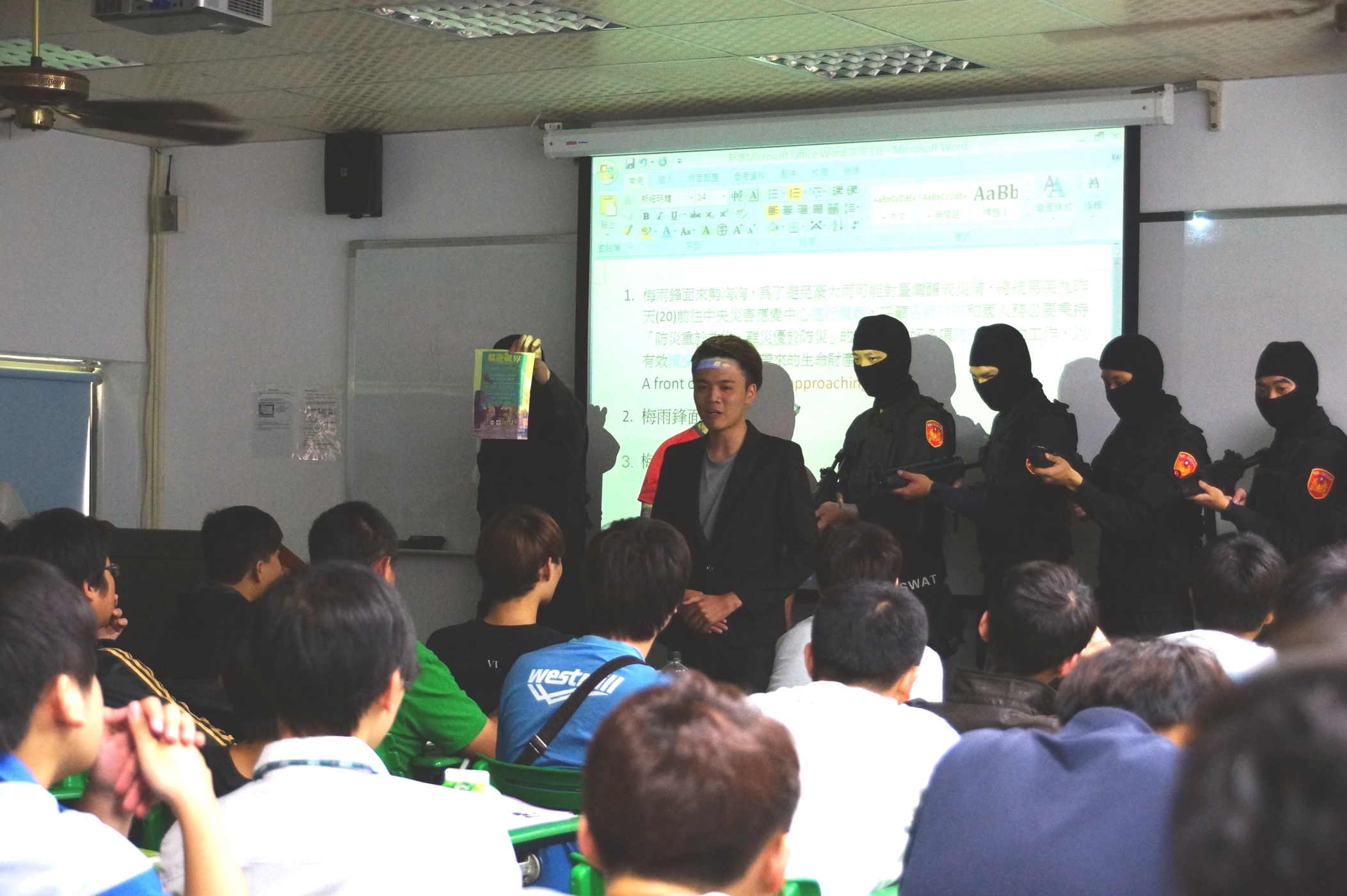 為了替自己畢業製作的電影影展宣傳,中州科技大學視訊傳播系學生假扮成霹靂小組特勤隊,全副武裝帶著衝鋒槍闖進課堂中,結果引起校園的一陣騷動,原本上課中的師生都目瞪口呆之際,假扮特勤警察的學生一一進行盤查,隨後拿出電影影展的宣...(詳全文) |