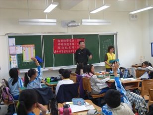 臺中市警察局第四分局帶領志工走入校園宣導婦幼安全暨反詐騙宣導,日前特別利用該校晨光時間,由第四分局教官鍾順安帶領黎明派出所警察志工,到教室內宣導婦幼、交通安全暨反詐騙活動,讓小朋友均感興奮不已。