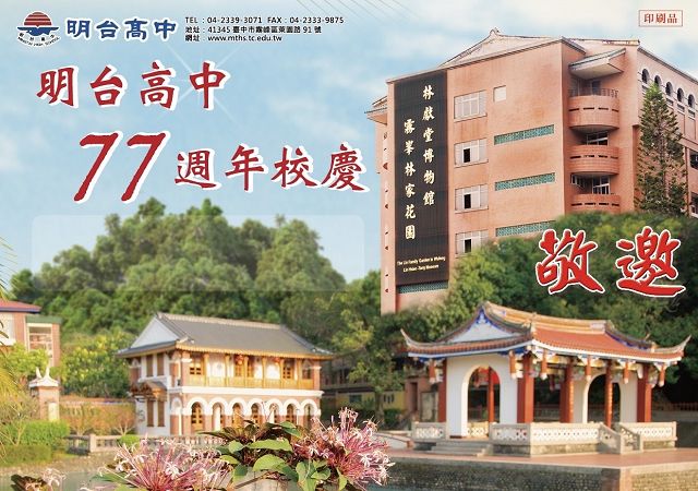 明台高中於114年5月16日歡慶77週年校慶,特別舉辦園遊會慶祝活動,邀請全體師生、貴賓、校友與家長齊聚一堂,共同見證學校的成長與榮耀。校慶當天由戰鼓祥獅報喜的熱烈氣氛中揭開序幕,緊接著由表...(詳全文) |
