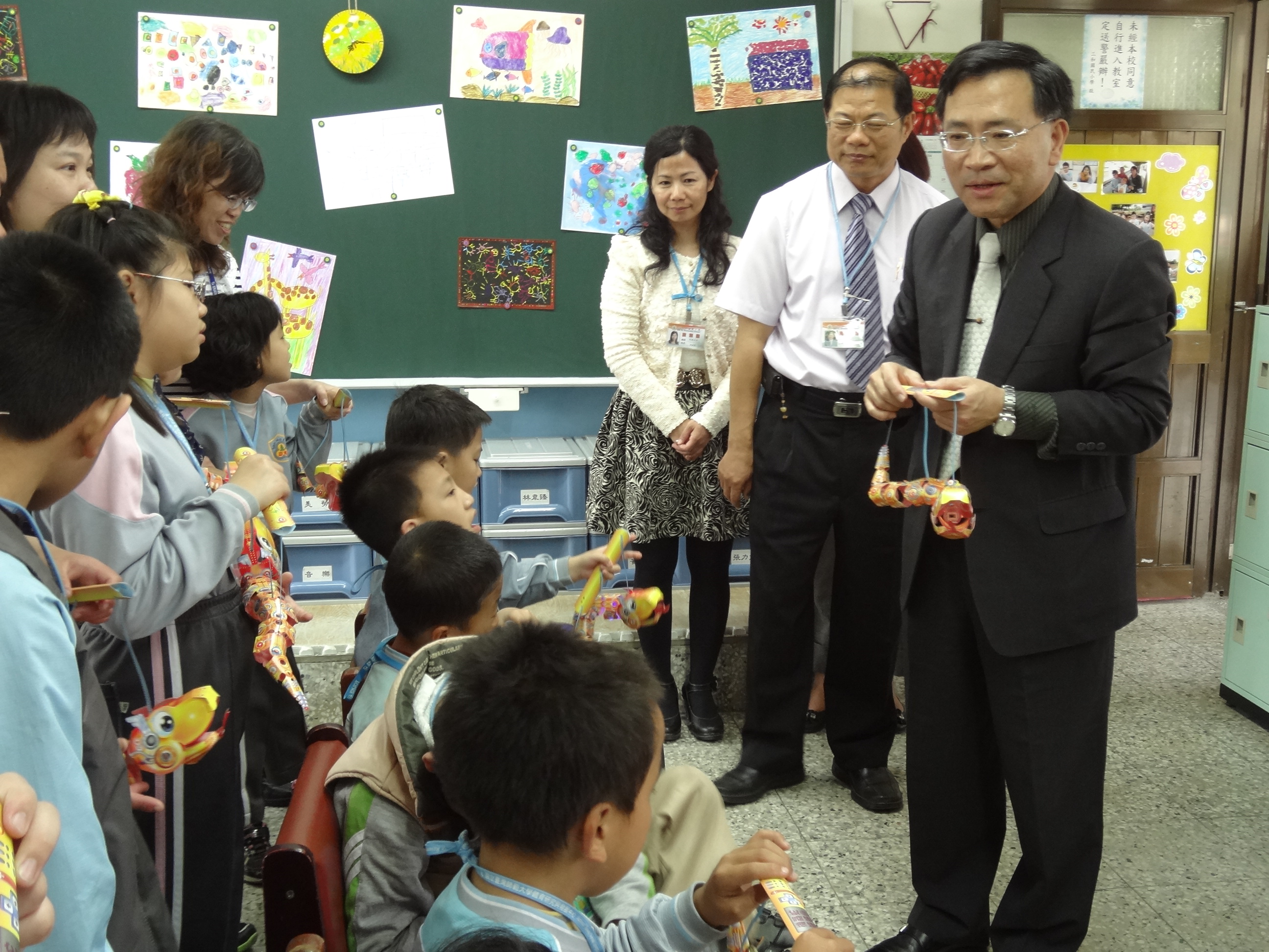 接著蔡炳坤到大雅區三和國小致贈兩班特教班共13位學生「妞妞小提燈」,並向小朋友說「蛇護士阿姨」的故事,去除小朋友怕蛇的恐懼心理;蔡副市長還參觀一位游姓特教生的圖畫與象的黏土,頻頻誇讚有天分,並希望學校好好教導。
