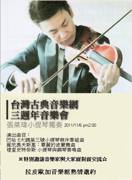 這次台灣古典音樂網三週年音樂會將在拉皮歐加音樂館演出,張桀瑋並與觀眾近距離的接觸,分享旅美的經驗、音樂學習之路及台灣古典音樂網的創辦理念。